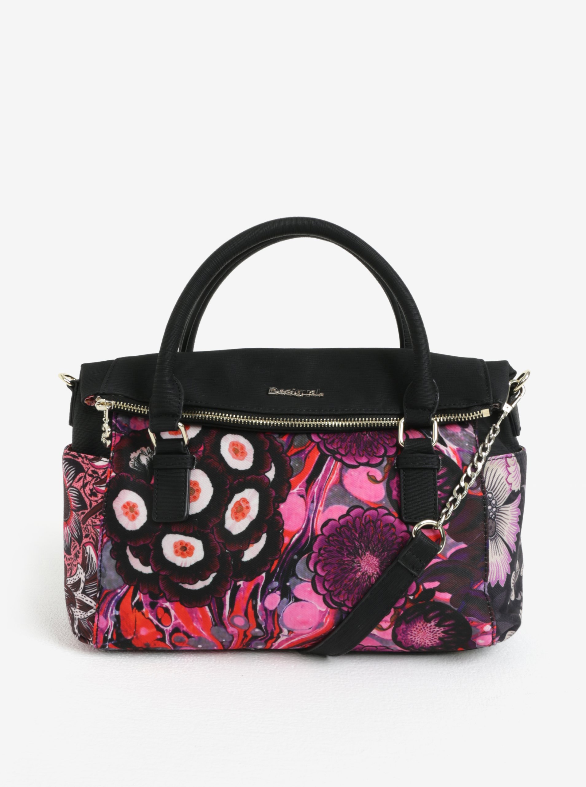 Proč byste se měla bát pestrých vzorů? S Desigualem vedle nešlápnete a užijete si veselou barevnost a rozmanitost vzorů. Typ: kabelka s odnímatelným popruhem, vzorem a přihrádkami na karty Barva: černá, červená, růžová Vzor: ornamenty Zapínání: karabiny, zip, magnetické patentky Úložný prostor: – jedna hlavní kapsa na zip a magnetickou patentku – jedna přední kapsa na zip a magnetickou patentku, která obsahuje přihrádky na karty a další kapsu na zip – tři vnitřní kapsy, z toho dvě na zip Materiál: kabelka – 100 % polyester podšívka – 100 % polyester ozdoby – 100 % polyuretan Vlastnosti materiálu: odolný, stálobarevný, pevný Něco výjimečného: ornamentální vzor Rozměry: 31 x 33 x 9 cm výška ucha – 12 cm max. délka popruhu – 137 cm A4 – vejde se