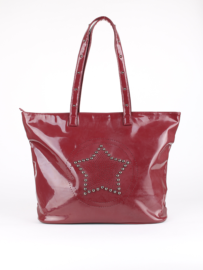 Kabelka Carpisa BORSE DONNA GRANDI. Dámská velká červená kabelka Carpisa v lesklém designu. Kabelka se zapíná na zip a je opatřena dvěma delšími uchy, takže jí lze nosit v ruce i přes rameno. Uvnitř je kapsa na zip. Kabelka je zdobena na přední straně kovovými cvočky a děrováním. Ze zadní strany je malá kapsa na zip. Materiál: 100% Syntetika