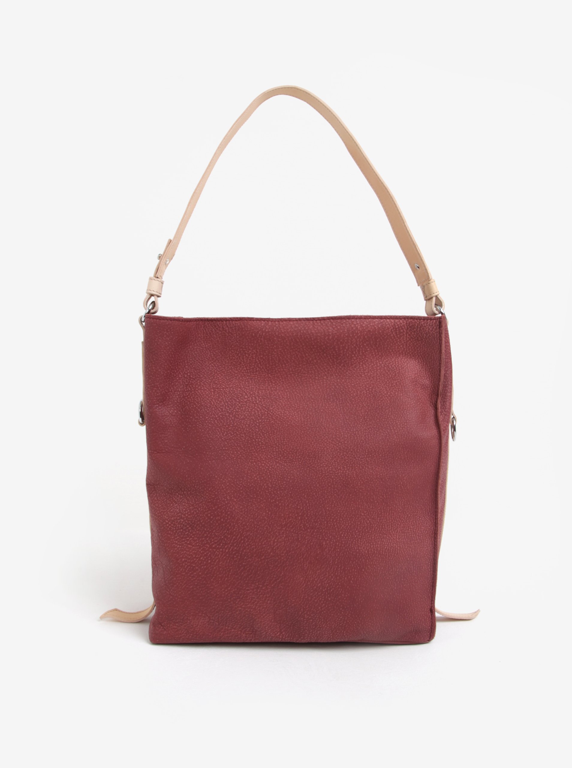Úchvatná kabelka pro každý den. Typ: velká kabelka z broušené kůže Barva: vínová, béžová Zapínání: zip Úložný prostor: jeden hlavní Počet kapes: – jedna vnitřní na zip – jedna vnitřní bez zapínání Specifikace: – český výrobek Materiál: vnější – 100 % pravá kůže vnitřní – 100 % PES Vlastnosti materiálu: pevný, odolný Něco nadčasového: ozdobné kovové kroužky na bocích kabelky Rozměry: kabelka – 35 x 37 x 14 cm délka odepínacího ucha – 35 cm formát A4 – vejde se
