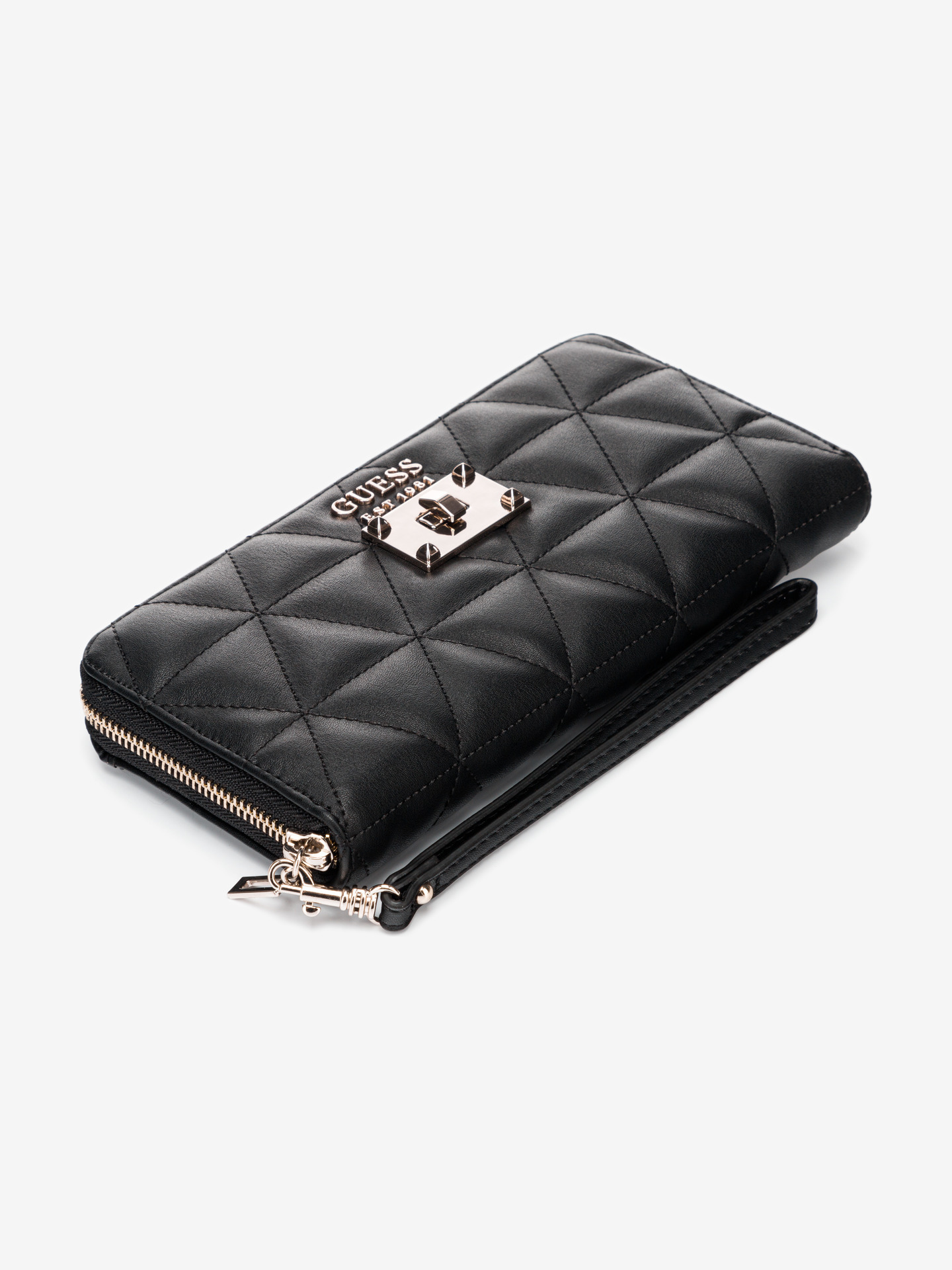 Materiál: 100% polyuretan Rozměry: 10×2,5×20,5 cm Povrch: prošívaný Zapínání: na zip Barva: černá Detail: kovové doplňky zlaté barvy