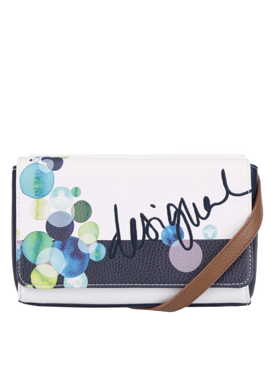 Kouzelná a praktická záležitost v kompaktním rozměru. Když kabelku, tak jedině Desigual . Barva: krémová, tmavě modrá Vzor: barevné kruhy, nápis Zapínání: magnet, zip Počet kapes: 3 Materiál: vnější část – 100 % polyuretan vnitřní část – 100 % polyester Vlastnosti materiálu: hladký Rozměry: 20,5 x 14,5 x 6 cm