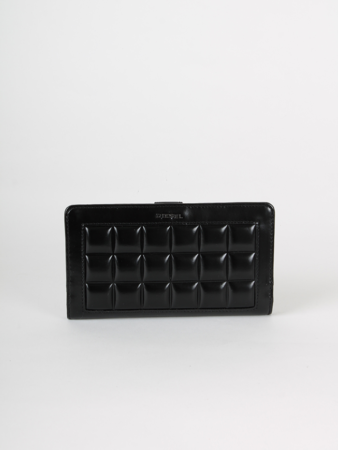 Peněženka Diesel HANDEE z černé koženky má na přední straně design vyražených čtverců a zavírá se na cvoček. Vevnitř jsou čtyři kapsy na bankovky, šest přihrádek na karty a průsvitné okénko. Na zadní straně peněženky je kapsička na zip určená na mince. Rozměry: šířka 17,5 cm, výška 10 cm a hloubka 2 cm. Materiál: 100% Polyuretan