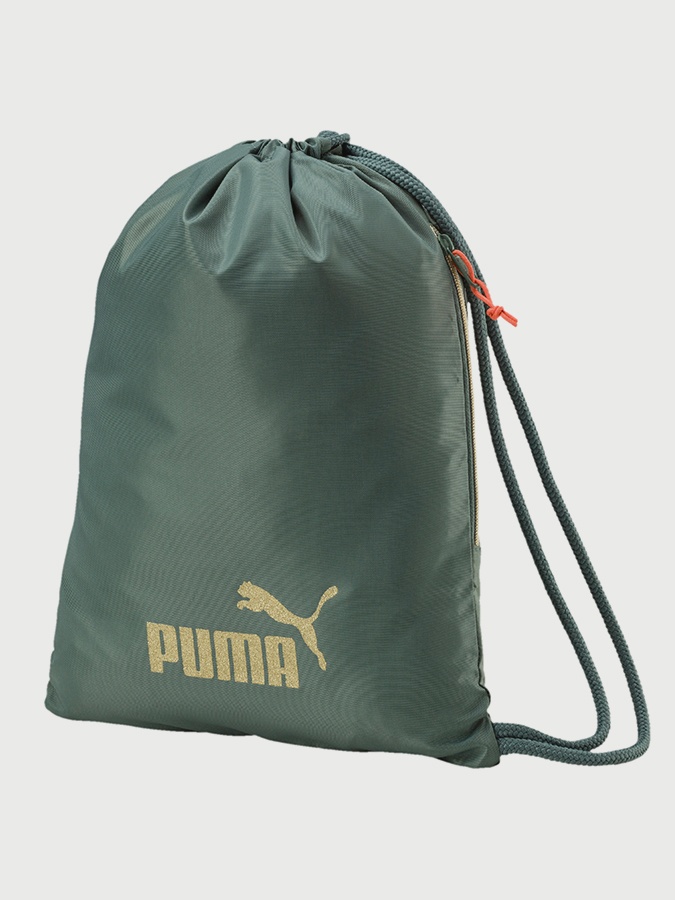 Vak Puma WMN Core Gym Sack Seasonal. Vak Puma WMN Core Gym Sack Seasonal. Velice stylovým kouskem je tento zelený vak se zlatým logem značky Puma. Byl navržen speciálně pro ženy a jejich sportovní aktivity. Vak se uzavírá za pomoci šňurek, které jsou zároveň nastavitelnými ramenními popruhy. Díky velice lehkému polyesterovému materiálu nijak nezatíží Vaše záda. Materiál: 100% Polyester